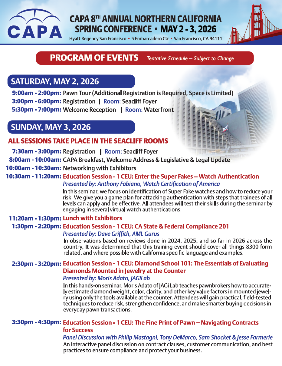 Effective January 1, 2026, all existing pawnshop licensees seeking renewal must complete eight hours of Continuing education (CE) approved by the California Pawnbroker Education Council. Good news for CAPA members: This required education will be included as part of your membership - with four hours available at the CAPA Spring Conference!